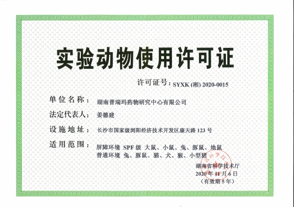 湖南省實(shí)驗(yàn)動物使用許可證(SYXK(湘)2020-0015)湖南省科學(xué)技術(shù)廳