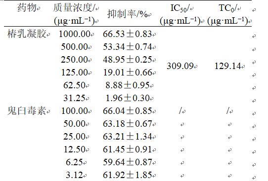 2.2 椿乳凝膠體外試驗(yàn) 2.2.1 椿乳凝膠對(duì)293FT細(xì)胞形態(tài)及增殖的影響 將293FT細(xì)胞按1.5×104/mL的密度鋪于96孔板中,置于37 ℃、5% CO2培養(yǎng)箱中培養(yǎng)過夜。待細(xì)胞長(zhǎng)成單層細(xì)胞后,用PBS溶液洗滌細(xì)胞2~3次,將椿乳凝膠(40 mg/mL)用含10% FBS的DMEM培養(yǎng)基分別稀釋6個(gè)質(zhì)量濃度(1000、500、250、125、62.5、31.25 μg/mL);鬼臼毒素設(shè)置6個(gè)濃度(100、50、25、12.5、6.25、3.125 μmoL/L),取每組藥物100 μL加入96孔板中,同時(shí)設(shè)置溶媒對(duì)照組,每組設(shè)3個(gè)復(fù)孔,置于37 ℃、5% CO2的培養(yǎng)箱中培養(yǎng),分別于24、48、72 h后于倒置熒光顯微鏡下觀察細(xì)胞的形態(tài),采用CellTiter-Glo發(fā)光法測(cè)定72 h后的細(xì)胞活性,并計(jì)算椿乳凝膠和鬼臼毒素的半數(shù)抑制濃度(half inhibitory concentration,IC50)及TC0(IC20),共重復(fù)3次。