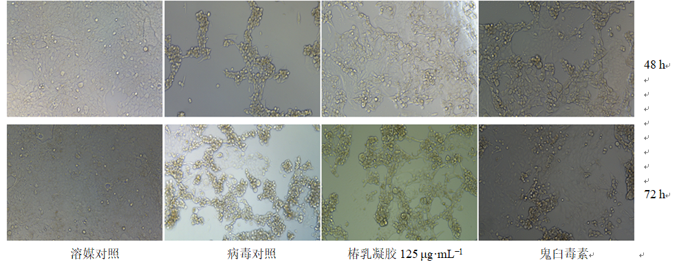 2.2.2 椿乳凝膠對(duì)HPV6、HPV11假病毒感染力的影響 將293FT細(xì)胞按1.5×104/mL的密度鋪于96孔板中,置于37 ℃、5% CO2培養(yǎng)箱培養(yǎng)24 h。用培養(yǎng)基將椿乳凝膠(125 μg/mL)和鬼臼毒素(3.12 μmoL/L)進(jìn)行多濃度稀釋。待細(xì)胞長(zhǎng)滿約80%左右時(shí)棄培養(yǎng)液加入100倍TCID50病毒液,100 μL/孔,再加入100 μL/孔的椿乳凝膠(125 μg/mL)和鬼臼毒素(3.12 μmoL/L),同時(shí)設(shè)置溶媒對(duì)照組(單純加入DMEM培養(yǎng)基),每組8個(gè)復(fù)孔,置于37 ℃、5% CO2培養(yǎng)箱中孵育24~72 h后。共重復(fù)3次,于倒置熒光顯微鏡下觀察并記錄實(shí)驗(yàn)組與對(duì)照組的細(xì)胞病變情況。