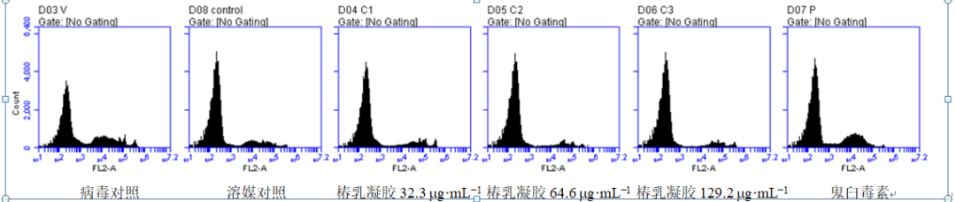 2.2.3 椿乳凝膠對(duì)293FT細(xì)胞周期的影響 將293FT細(xì)胞按1.5×106/孔的密度鋪于6孔板中,置于37 ℃、5% CO2培養(yǎng)箱中培養(yǎng)過夜,待細(xì)胞長(zhǎng)至80%左右時(shí),用PBS溶液洗滌細(xì)胞2~3次,加入100倍TCID50病毒液,100 μL/孔。在100 μL/孔培養(yǎng)基中分別加入低、中、高質(zhì)量濃度(32.3、64.6、129.2 μg/mL)的椿乳凝膠和鬼臼毒素(3.12 μmoL/L),同時(shí)設(shè)置病毒對(duì)照組和溶媒對(duì)照組。將細(xì)胞培養(yǎng)板置于37 ℃、5% CO2的培養(yǎng)箱中孵育48 h后,1000 r/min離心3 min收集細(xì)胞;加入10 μL碘化丙啶(PI)至終濃度20 μg/mL(用190 μL 1×Binding Buffer稀釋),4 ℃避光染色30 min,離心;加入200 μL 1×Binding Buffer清洗,離心;加入200 μL PBS溶液重懸細(xì)胞,用流式細(xì)胞儀進(jìn)行細(xì)胞周期數(shù)據(jù)的收集和分析(單次流式細(xì)胞儀檢測(cè),1份樣品細(xì)胞數(shù)量約106)。