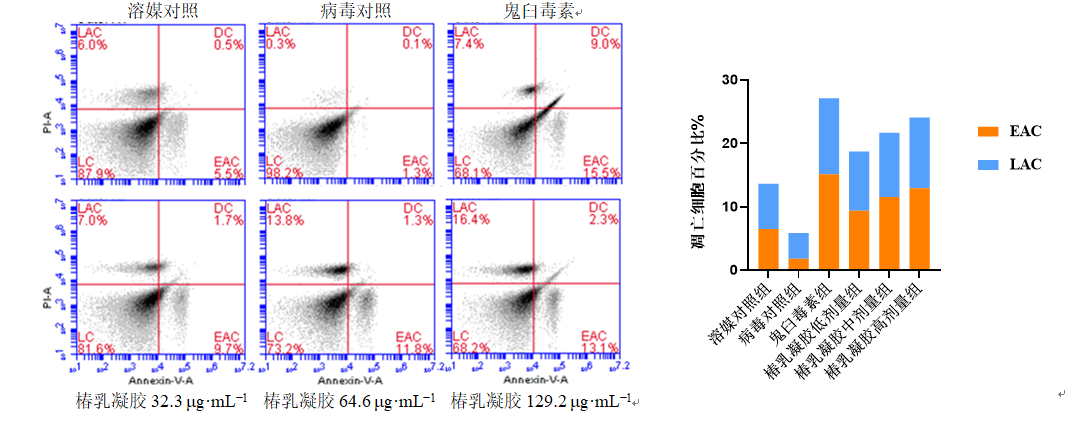 2.2.4 椿乳凝膠對(duì)293FT細(xì)胞凋亡的影響 將293FT細(xì)胞按1.5×106/孔的密度鋪于6孔板中,置于37 ℃、5% CO2培養(yǎng)箱中培養(yǎng)過夜,待細(xì)胞長(zhǎng)至80%左右時(shí),用PBS溶液洗滌細(xì)胞2~3次,加入制備得到的100倍TCID50的HPV6和HPV11假病毒液,100 μL/孔。繼續(xù)培養(yǎng)2 h后更換為低、中、高質(zhì)量濃度(32.3、64.6、129.2 μg/mL)的椿乳凝膠和鬼臼毒素(3.12 μmoL/L),100 μL/孔,同時(shí)設(shè)置病毒對(duì)照組和溶媒對(duì)照組。將細(xì)胞培養(yǎng)板置于37 ℃、5% CO2的培養(yǎng)箱中孵育48 h后,1000 r/min離心3 min收集細(xì)胞,用PBS輕輕吹打洗滌細(xì)胞2次,用200 μL 1×Binding Buffer重懸細(xì)胞,再用195μL細(xì)胞懸液中加入Annexin V-FITC,室溫混合孵育10min;加入200 μL 1×Binding Buffer洗滌細(xì)胞,再用190 μL 1×Binding Buffer重懸細(xì)胞,加入PI室溫孵育10 min后,加入200 μL 1×Binding Buffer清洗細(xì)胞;加入200 μL PBS溶液重懸細(xì)胞,進(jìn)行流式細(xì)胞儀檢測(cè),共重復(fù)3次。