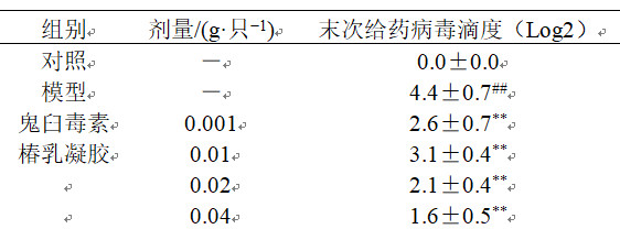 3.2.3 對(duì)宮頸組織病毒滴度的影響 如表4所示,與對(duì)照組比較,模型組宮頸組織病毒滴度明顯升高(P<0.01);與模型組比較,各給藥組宮頸組織病毒滴度均明顯降低(P<0.01) 表4 椿乳凝膠對(duì)宮頸組織病毒滴度的影響 (, n = 8)