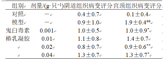 3.2.5 組織病理學(xué)評(píng)分 如表5所示,與對(duì)照組比較,模型組宮頸組織病變?cè)u(píng)分明顯升高(P<0.01),陰道組織病變?cè)u(píng)分有增加趨勢(shì),但無統(tǒng)計(jì)學(xué)差異;與模型組比較,鬼臼毒素組和椿乳凝膠中、高劑量組宮頸組織病變?cè)u(píng)分均明顯降低(P<0.05、0.01)。各給藥組陰道組織病變?cè)u(píng)分與模型組比較,均無統(tǒng)計(jì)學(xué)差異。 表5 椿乳凝膠對(duì)組織病變?cè)u(píng)分的影響 (, n = 8)