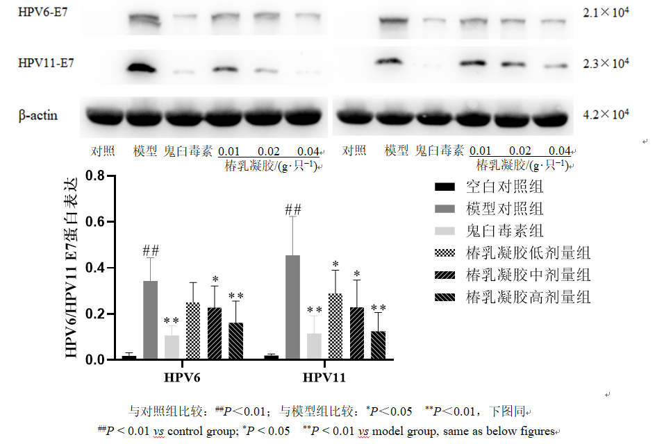 3.2.6 對(duì)HPV6、HPV11的E7蛋白表達(dá)的影響 如圖7所示,與對(duì)照組比較,模型組HPV6、HPV11的E7蛋白表達(dá)水平均明顯增加(P<0.01);與模型組比較,鬼臼毒素組HPV6、HPV11的E7蛋白表達(dá)水平明顯降低(P<0.01),椿乳凝膠各劑量組HPV11的E7蛋白表達(dá)水平均明顯降低(P<0.05、0.01),椿乳凝膠中、高劑量組HPV6的E7蛋白表達(dá)水平均明顯降低(P<0.05、0.01)。