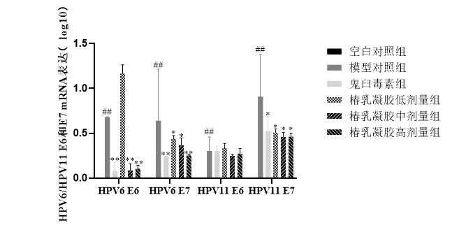 圖8 椿乳凝膠對(duì)小鼠宮頸組織HPV6、HPV11 E6/E7 mRNA表達(dá)的影響(n=6)