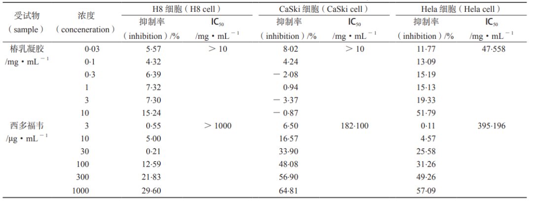 3、結(jié)果 3.1 椿乳凝膠對(duì)H8、CaSki和Hela細(xì)胞增殖的影響 H8、CaSki和Hela細(xì)胞給予不同濃度的椿乳凝膠后,鏡下觀察,H8和CaSki細(xì)胞形態(tài)學(xué)未出現(xiàn)明顯變化,細(xì)胞增殖未受到明顯影響,細(xì)胞增殖抑制率均<20%。在高濃度下,Hela細(xì)胞出現(xiàn)增殖速度減慢,細(xì)胞碎片增多、細(xì)胞間的間隙增大、部分細(xì)胞呈空泡狀等現(xiàn)象。且Hela細(xì)胞狀態(tài)與椿乳凝膠濃度有明確相關(guān)性,在10 mg·mL-1濃度條件下可見較多無法維持完整細(xì)胞形態(tài),見圖1。經(jīng)Bliss法計(jì)算,得出椿乳凝膠對(duì)Hela細(xì)胞的IC50=47.558 mg·mL-1,從表1可知椿乳凝膠對(duì)CaSki細(xì)胞的IC50在3~10 mg·mL-1,TC0>3 mg·mL-1;西多福韋對(duì)CaSki和Hela細(xì)胞的IC50分別為182.100和395.196 μg·mL-1。細(xì)胞存活率≥80%,則認(rèn)為對(duì)細(xì)胞無毒性作用,記為TC0,以H8細(xì)胞TC0、1/2TC0、1/4TC0為后續(xù)實(shí)驗(yàn)的濃度。 因此,椿乳凝膠高、中、低終濃度設(shè)置為5、2.5、1.25 mg·mL-1,西多福韋終濃度為100、50、25 μg·mL-1。
