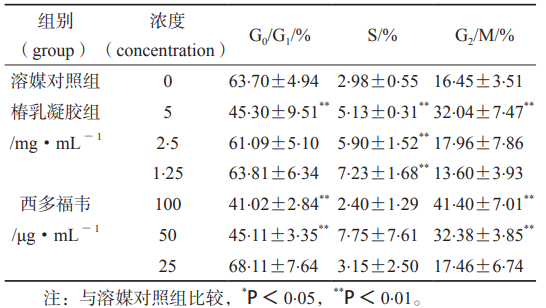 3.2 椿乳凝膠對(duì)人宮頸上皮細(xì)胞周期的影響 細(xì)胞周期分析結(jié)果顯示:在G0/G1細(xì)胞比例明顯減少,S期細(xì)胞比例增加,G2/M期細(xì)胞比例明顯增加,表明其對(duì)宮頸上皮細(xì)胞的修復(fù)作用可能是通過減少間期休眠的細(xì)胞,促進(jìn)其進(jìn)入G2/M期,促進(jìn)細(xì)胞分裂,從而加速受損上皮細(xì)胞的更新。詳見表2。