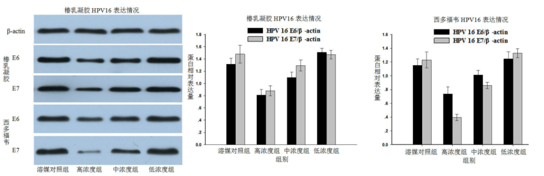 圖 5 椿乳凝膠對(duì)CaSki細(xì)胞攜帶的HPV16 E6/E7表達(dá)的影響