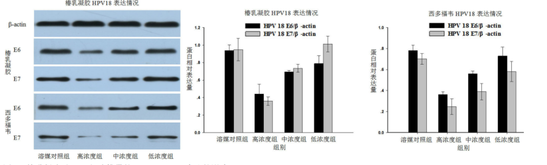 圖 6 椿乳凝膠對(duì)Hela細(xì)胞攜帶的HPV18 E6/E7表達(dá)的影響