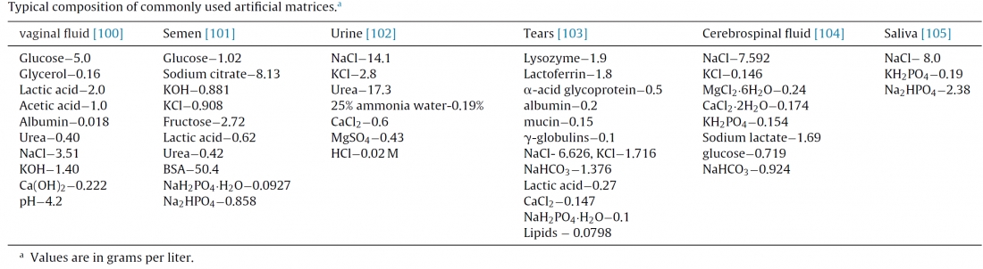 2.人造基質(zhì) 人造基質(zhì)選擇原則是不含分析物且成分、鹽含量、分析物溶解度、提取回收率和基質(zhì)效應(yīng)方面與真實基質(zhì)類似。常見的人造基質(zhì)包括PBS(pH7.4)、牛血清蛋白(BSA)和人血清白蛋白(HSA)等,牛血清蛋白(BSA)和人血清白蛋白(HSA)常見濃度為20~80g/L。例如,大鼠全血和皮膚勻漿液中左旋肉堿(MC)定量分析替代基質(zhì)為BSA水溶液(2g/L),人血漿中不飽和脂肪酸和生長素定量分析替代基質(zhì)為等滲鹽水溶液。表2和表3為常見的人造基質(zhì)。