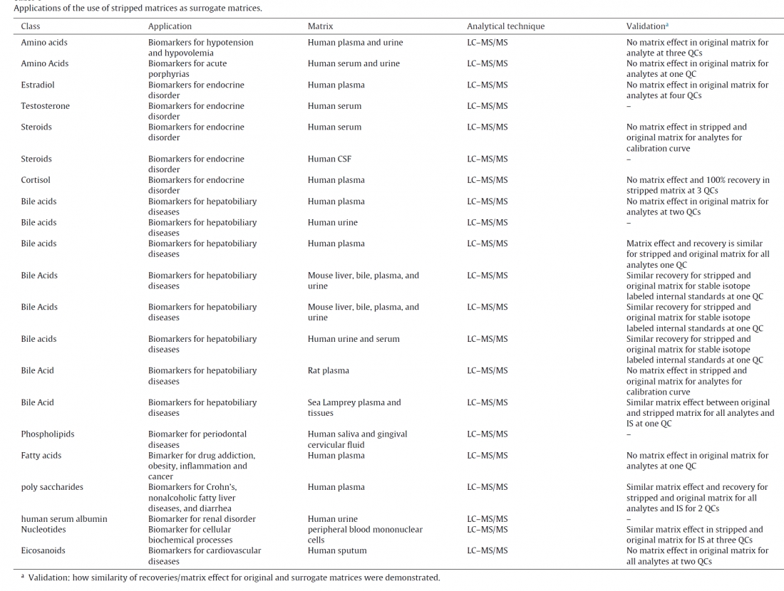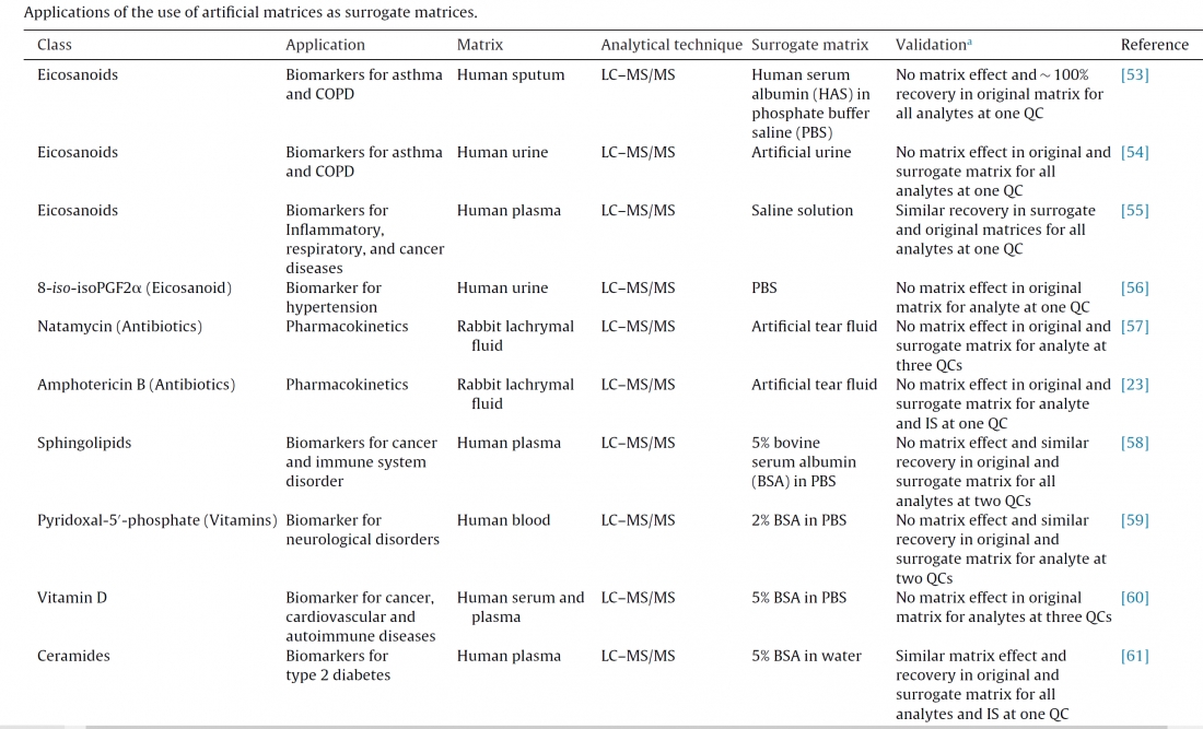 內(nèi)源性化合物是機體內(nèi)已存在的和代謝過程中所形成的產(chǎn)物或中間產(chǎn)物,包括維生素、激素、蛋白質(zhì)及電解質(zhì)等。內(nèi)源性化合物廣泛分布于機體內(nèi),在細胞增殖、組織修復(fù)、疾病診斷和治療、機體自身穩(wěn)態(tài)調(diào)節(jié)等方面發(fā)揮著重要作用。當前,內(nèi)源性化合物發(fā)展的瓶頸效應(yīng)已經(jīng)由生物標志物的發(fā)現(xiàn)轉(zhuǎn)移到評估和定量上。內(nèi)源性化合物的定性和定量分析是非常復(fù)雜和困難的,干擾成分多、基質(zhì)效應(yīng)大、濃度范圍狹窄或周期性變化等都是影響內(nèi)源性化合物定量的重要因素。此外,目前尚無關(guān)于內(nèi)源性化合物分析方法驗證的統(tǒng)一指南,這也是制約內(nèi)源性化合物應(yīng)用的關(guān)鍵因素。 內(nèi)源性化合物精準定量分析在非臨床和臨床研究中意義重大,隨著液質(zhì)聯(lián)用技術(shù)的發(fā)展,LC-MS/MS已成為內(nèi)源性化合物定量分析首選工具。內(nèi)源性化合物定量分析包括相對定量、半定量和絕對定量,絕對定量可細分為標準加入法、背景扣除法、替代分析物法和替代基質(zhì)法,其中替代基質(zhì)法應(yīng)用最為廣泛。內(nèi)源性化合物絕對定量因缺少真正意義上的空白基質(zhì),故在其分析過程中尋找合適的替代基質(zhì)是重中之重工作。常見的替代基質(zhì)包括純?nèi)芤?、人工基質(zhì)和不含分析物真實基質(zhì)。 1.純?nèi)芤?/span> 純?nèi)芤菏亲詈唵纬S玫奶娲|(zhì)之一,最常見的純?nèi)芤簽樗土鲃酉?,使用純?nèi)芤鹤鳛樘娲|(zhì)需要驗證分析物提取回收率和基質(zhì)效應(yīng)是否和真實基質(zhì)具有一致性。表1總結(jié)了近年來利用純?nèi)芤鹤鳛樘娲|(zhì)進行定量分析的內(nèi)源性化合物。例如,人血清中血栓素B2和12(S)-羥基二十碳四烯酸替代基質(zhì)選用水/甲醇/乙腈(80:10:10, v:v:v),大鼠全血和肝臟勻漿液中丙二酰輔酶A(Malonyl-CoA)替代機制為水/三氯乙酸(90:10, v:v),大鼠骨骼肌勻漿液葡糖腦苷脂(GC)定量分析替代基質(zhì)為甲醇。