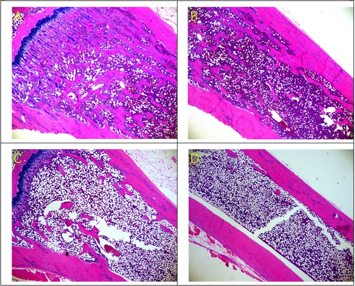 4.骨質(zhì)疏松模型脛骨顯微鏡下觀察結(jié)果 假手術(shù)組動(dòng)物:骨小梁數(shù)量及厚度、骨皮質(zhì)厚度均未見(jiàn)明顯異常改變(圖A-B); 模型組動(dòng)物:可見(jiàn)骨小梁和/或皮質(zhì)骨減少,鏡下表現(xiàn)為骨小梁數(shù)量及厚度明顯減少甚至消失,脂肪細(xì)胞數(shù)量顯著增加,骨皮質(zhì)厚度略有減少(圖C-D)。