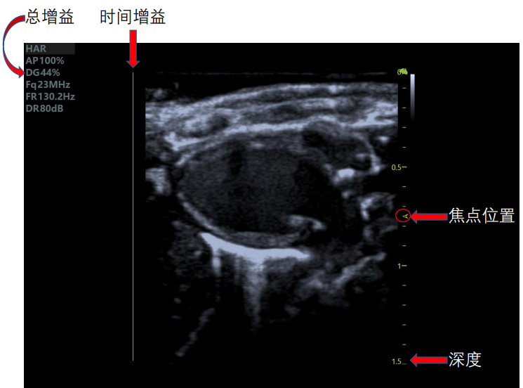 4.增益調(diào)節(jié):增益調(diào)節(jié)至看到組織且不刺眼即可,增大增益會(huì)使圖像更加明亮清晰,降低增益,可減少噪聲,使圖像更清晰。