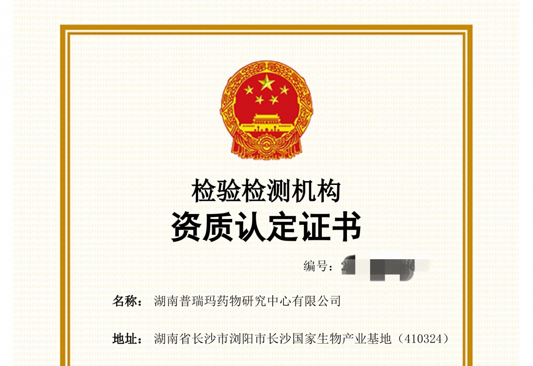 湖南普瑞瑪藥物研究中心有限公司順利取得醫(yī)療器械檢驗檢測機構(gòu)資質(zhì)認定證書